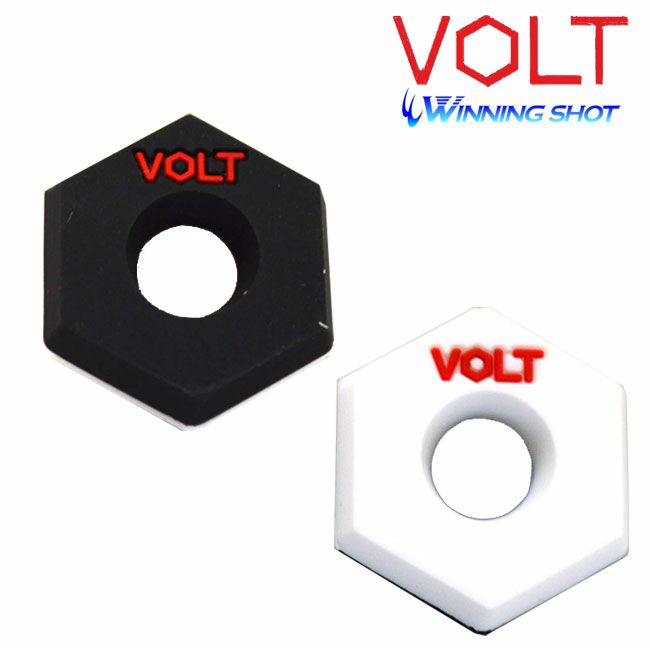 【硬式テニスラケット用振動止め】 正6角形ガット「VOLT」をイメージして作られた振動止め!シリコン素材にもこだわりました! 表面はVOLTをイメージした黒、裏面はVOLTパワーをイメージした白。 大会景品、プレゼントなどにもオススメです!